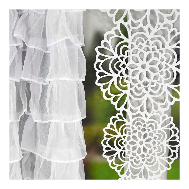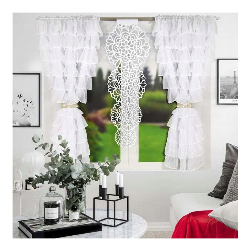 Set decorativ: două perdele din voal cu volănaşe fine şi un panou ajurat „prinzător de vise”. Oferă un efect armonios, permite prinderi creative cu panglici şi ajută la protecţia împotriva soarelui puternic. Din cauza procesului de producţie, timpul de livrare este mai lung.