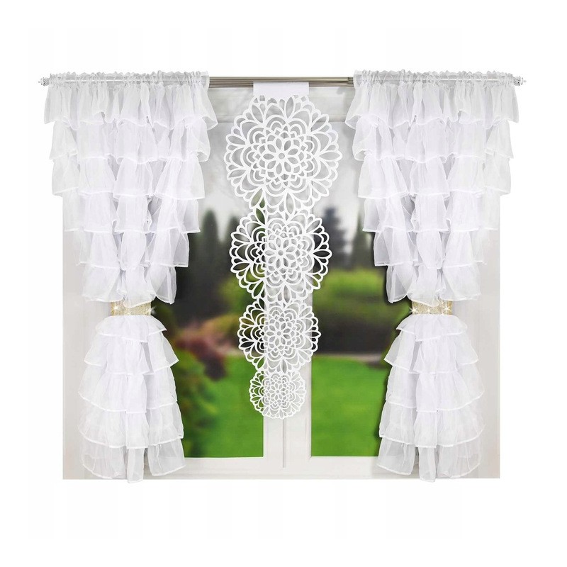 Acest set creează o amenajare elegantă şi coerentă a ferestrei: două perdele decorative şi un panou ajurat „prinzător de vise” care formează împreună un ansamblu armonios. Voalul cu volănaşe aduce lejeritate şi fineţe, iar panoul nu este doar un detaliu decorativ, ci ajută şi la protecţia împotriva expunerii excesive la soare. În set găseşti panglici elegante, cu care poţi prinde perdelele creativ şi poţi ajusta aspectul în funcţie de stilul casei tale. Din cauza procesului de producţie, timpul de livrare este mai lung.