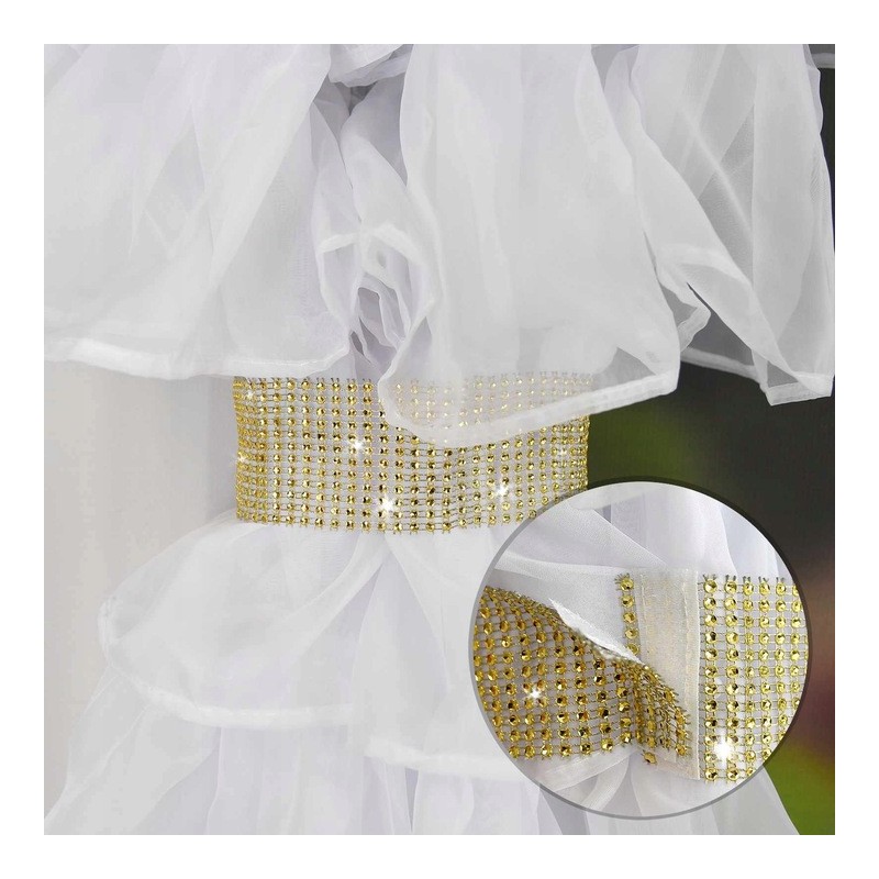 Setul alb cu accente aurii are un aspect elegant şi decorativ. Panoul ajurat şi volănaşele delicate creează un efect aerat, iar panglicile aurii adaugă un accent vizual deosebit.