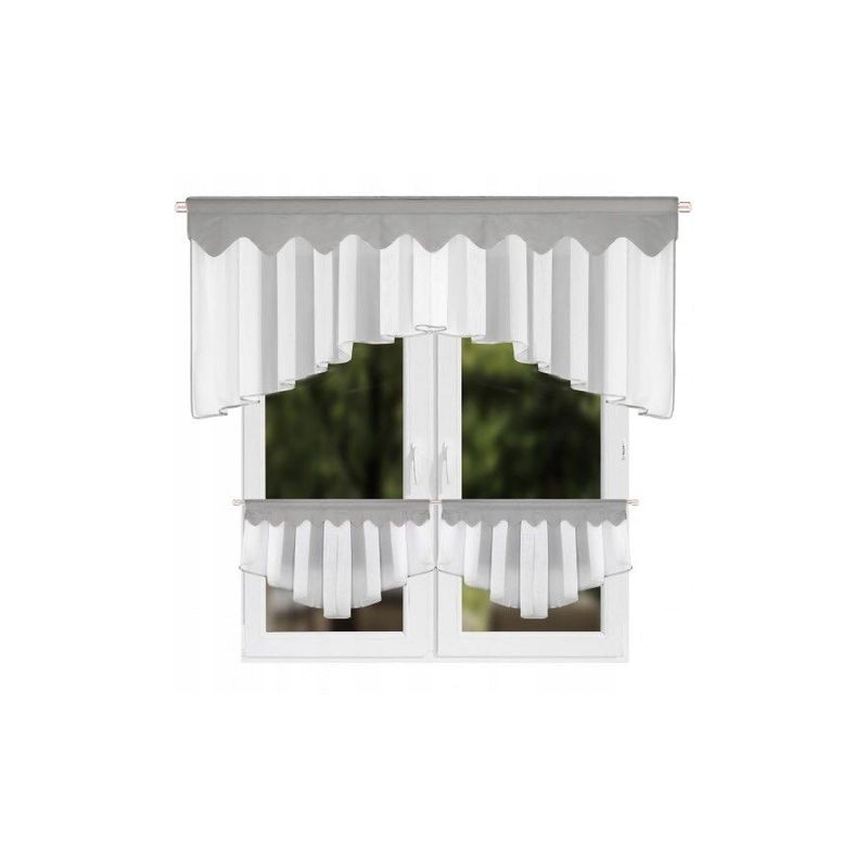 Set elegant pentru bucătărie: perdea din voal 200x80 cm şi perdele tip cafenea 90x50 cm, finisate cu bordură gri. Încălzeşte vizual încăperea, filtrează delicat lumina şi ajută la păstrarea intimităţii, iar modelul discret oferă ferestrei personalitate. Din cauza procesului de producţie, timpul de livrare este mai lung.