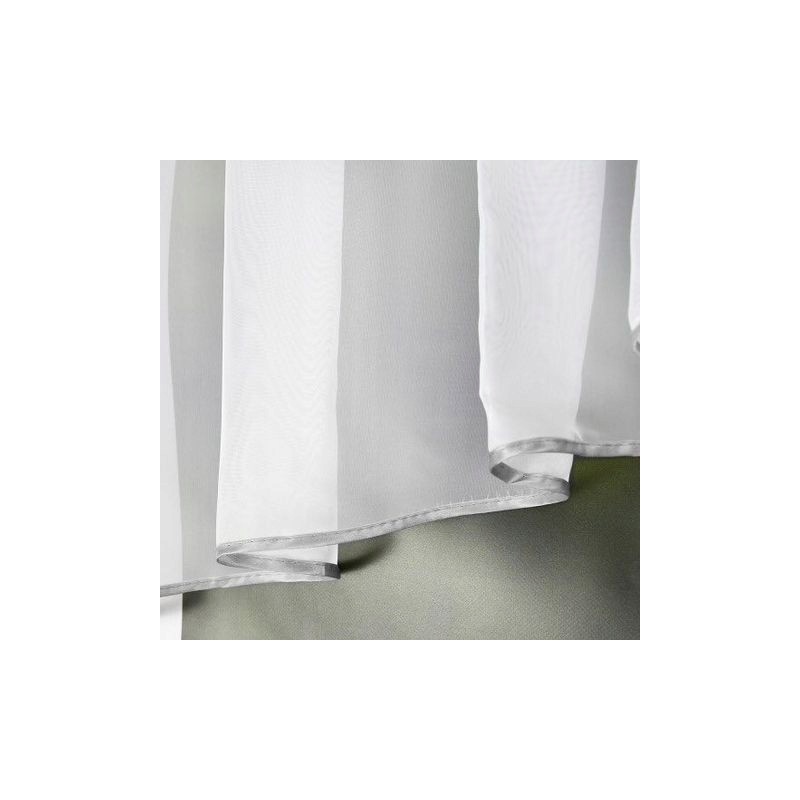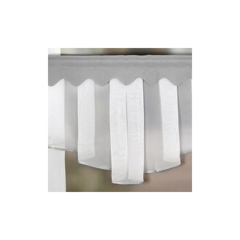 Setul este realizat din voal alb delicat. Materialul este poliester durabil şi rezistent la şifonare. Banda de încreţire cusută facilitează aranjarea şi permite adaptarea rapidă la lăţimea ferestrei. Bordura gri completează finisajul într-un mod estetic.