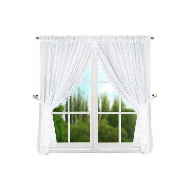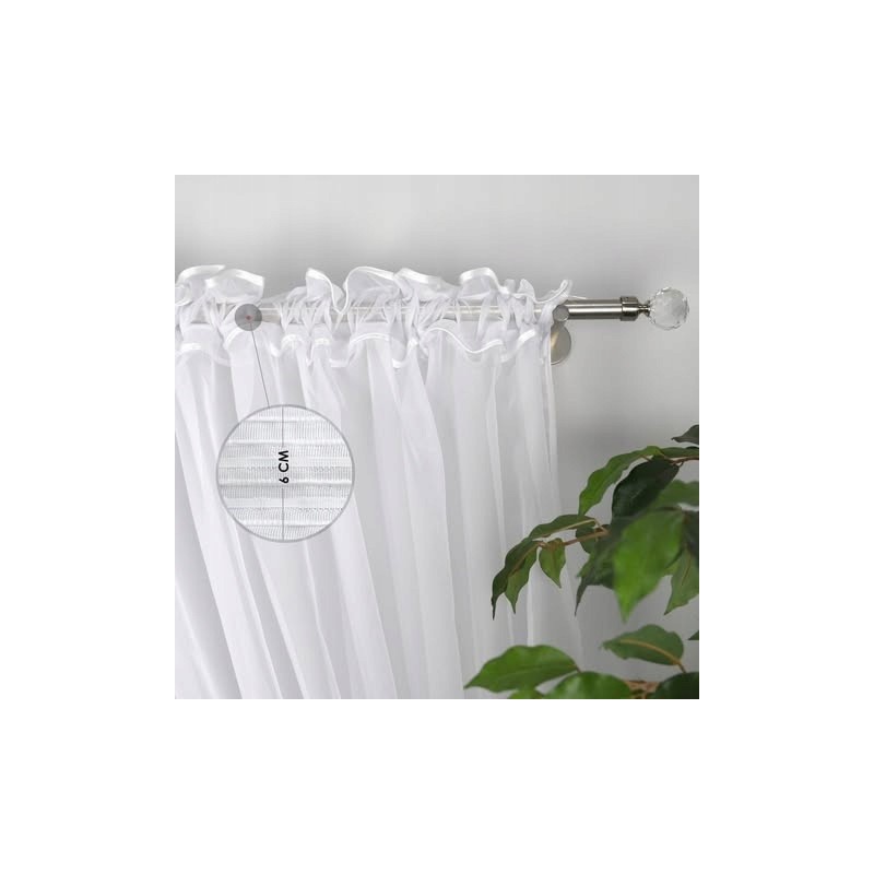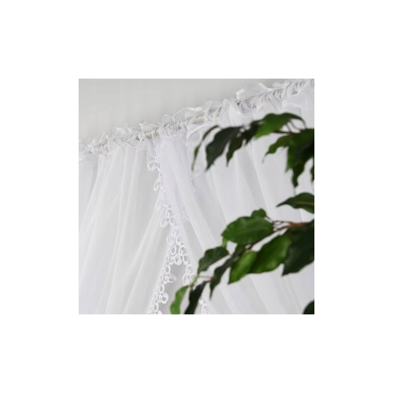 Perdea elegantă din voal alb cu dantelă decorativă, 400x150 cm. Difuzează delicat lumina şi oferă o atmosferă luminoasă şi primitoare, iar banda cusută ajută la agăţare rapidă. Din cauza procesului de producţie, timpul de livrare este mai lung.