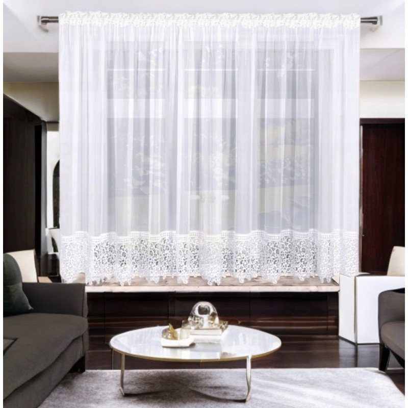 Perdea modernă din voal alb, cu dantelă spectaculoasă de 30 cm şi fir uşor strălucitor. Difuzează frumos lumina, creează o atmosferă luminoasă şi confortabilă şi adaugă un plus de eleganţă. Din cauza procesului de producţie, timpul de livrare este mai lung.