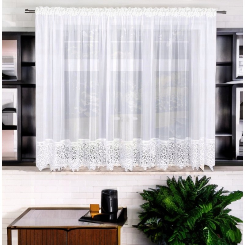 Materialul este voal alb uşor, completat de dantelă de 30 cm cu fir uşor strălucitor. Compoziţie: 100% poliester, rezistent la deformare şi la decolorare. Banda de încreţire cusută, cu tunel, permite montaj facil şi un aranjament estetic. Lateralele sunt finisate prin tivire pentru o margine netedă şi îngrijită.