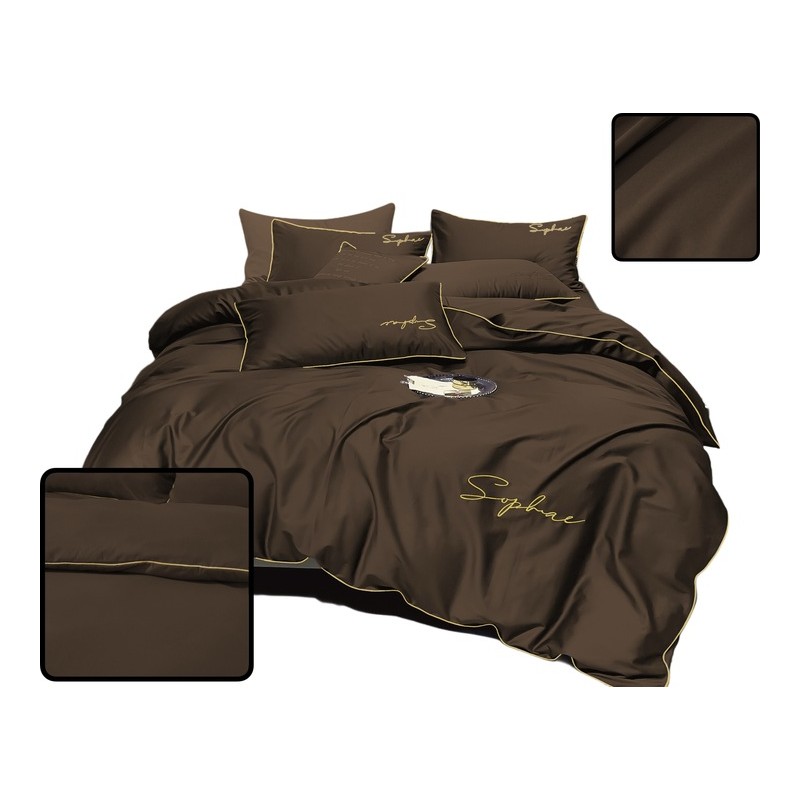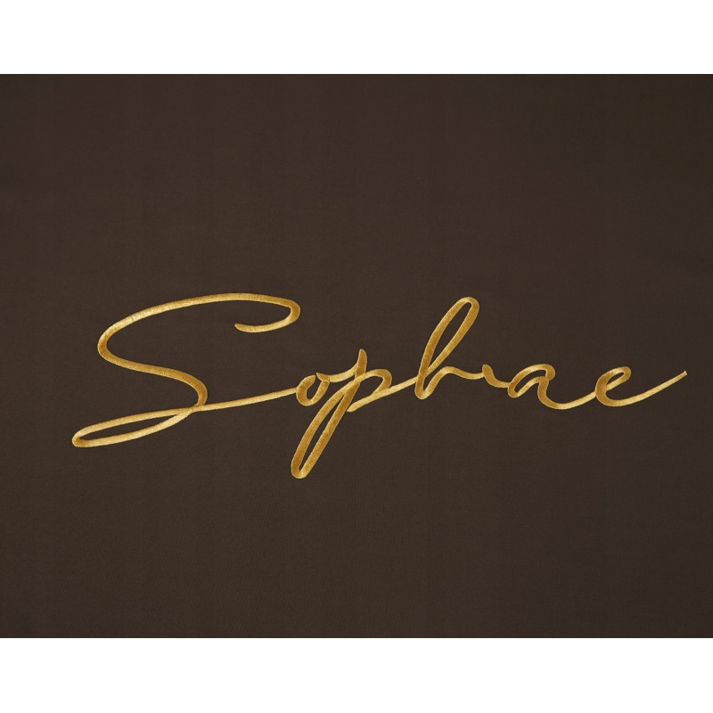 Nuanţa de ciocolată, pusă în valoare de bordura aurie, creează un efect armonios şi sofisticat. Inscripţia brodată adaugă un detaliu discret, care diferenţiază setul şi îmbunătăţeşte atmosfera dormitorului.