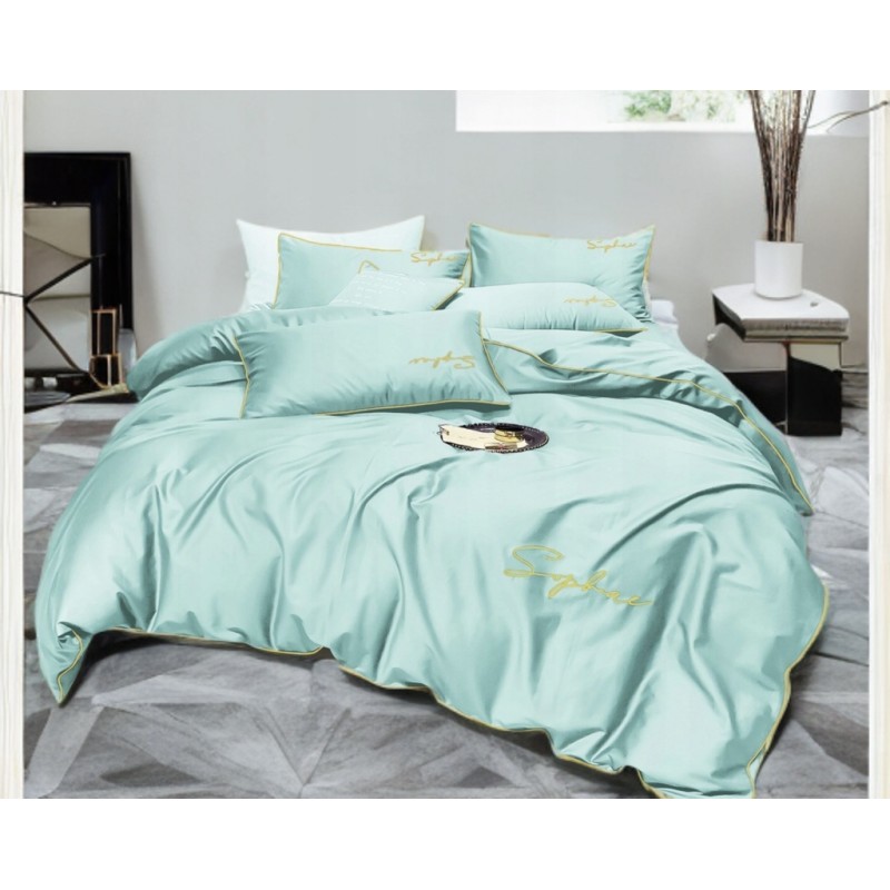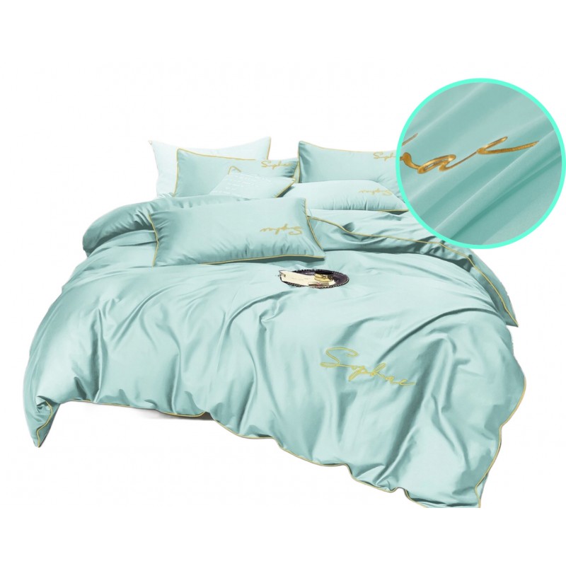 Culoarea mentă, pusă în valoare de bordura aurie, creează un efect proaspăt şi sofisticat. Inscripţia brodată adaugă un detaliu discret, care diferenţiază setul şi îmbunătăţeşte atmosfera dormitorului.