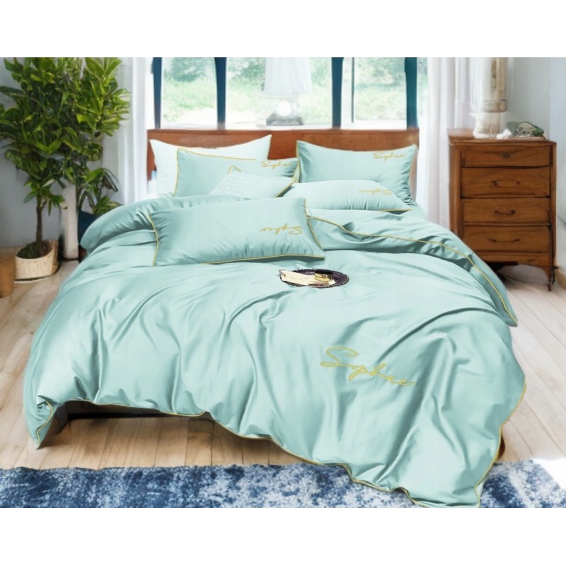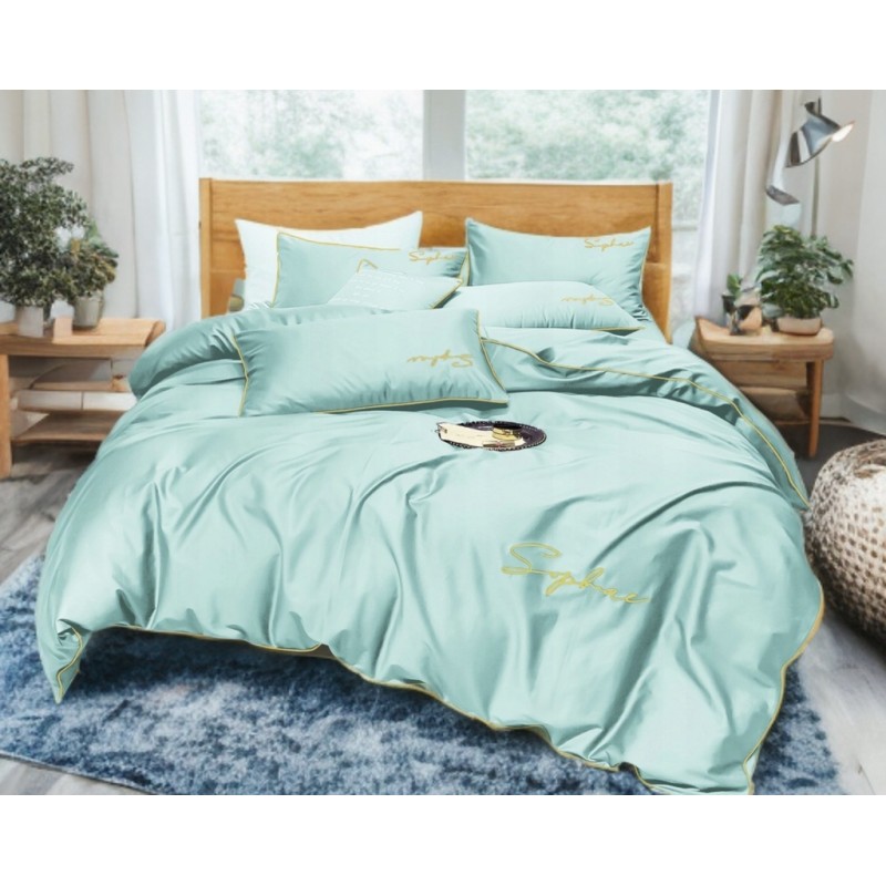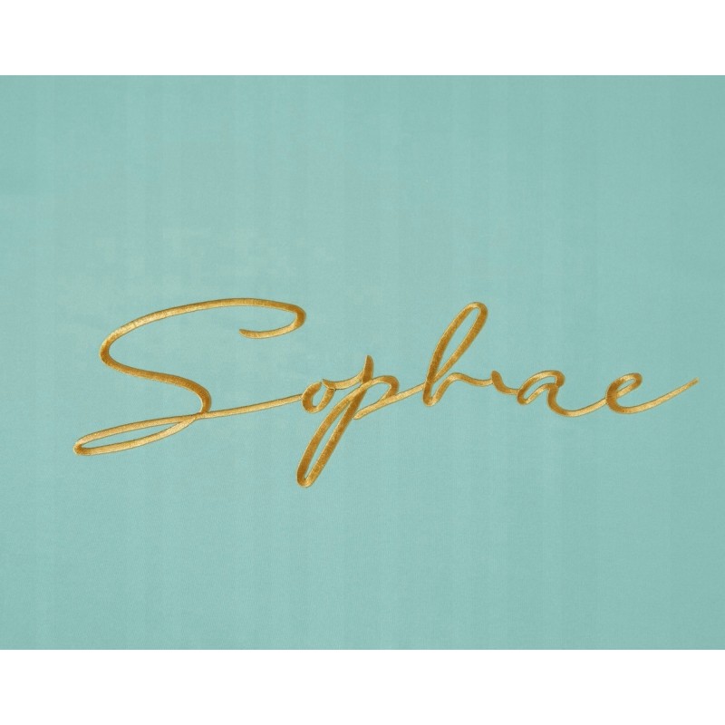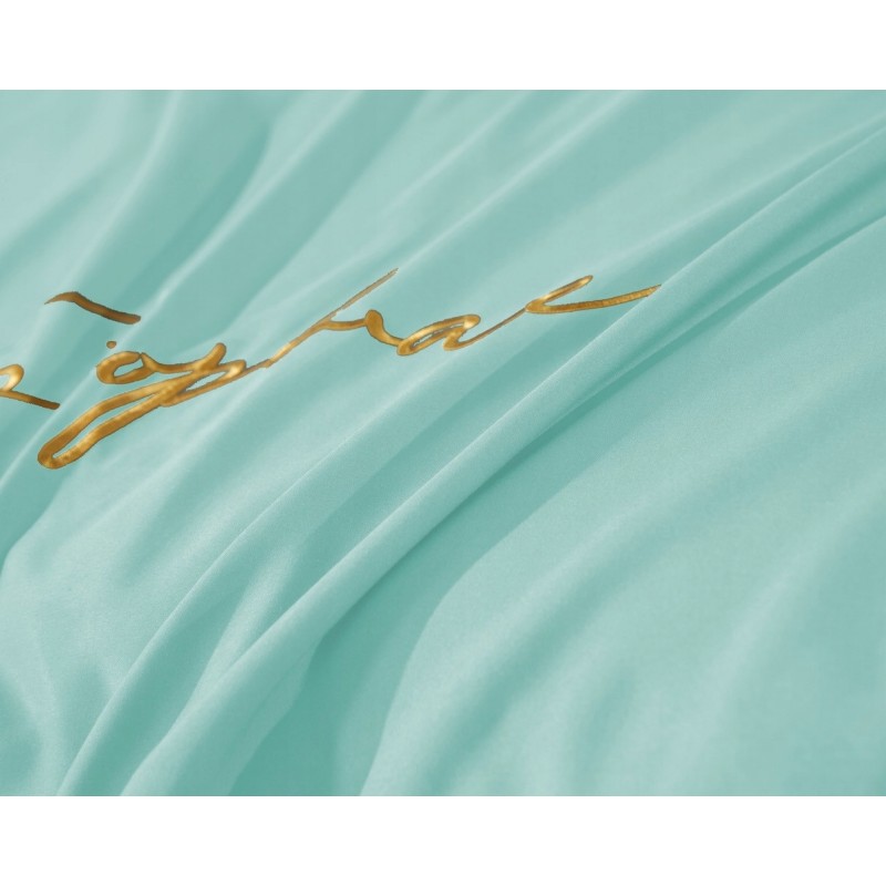 Culoarea mentă, pusă în valoare de bordura aurie, creează un efect proaspăt şi sofisticat. Inscripţia brodată adaugă un detaliu discret, care diferenţiază setul şi îmbunătăţeşte atmosfera dormitorului.