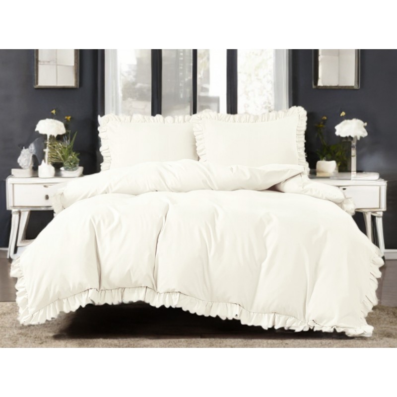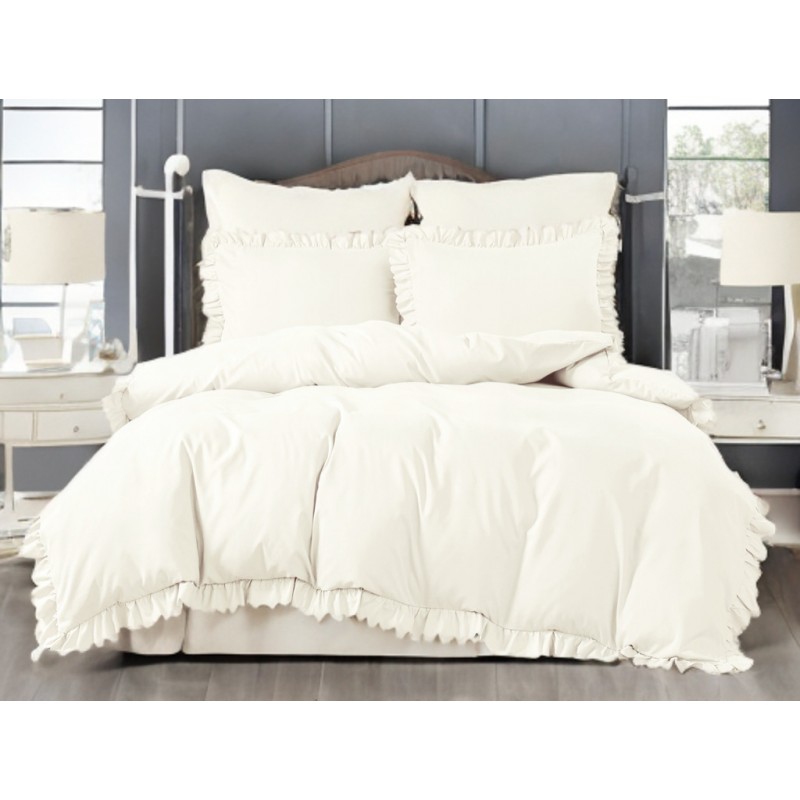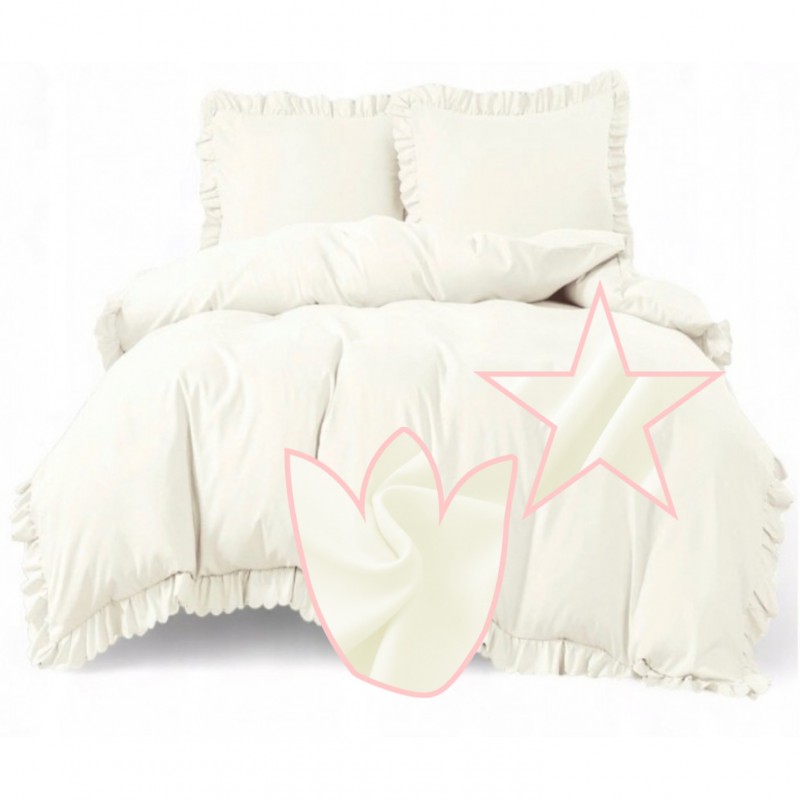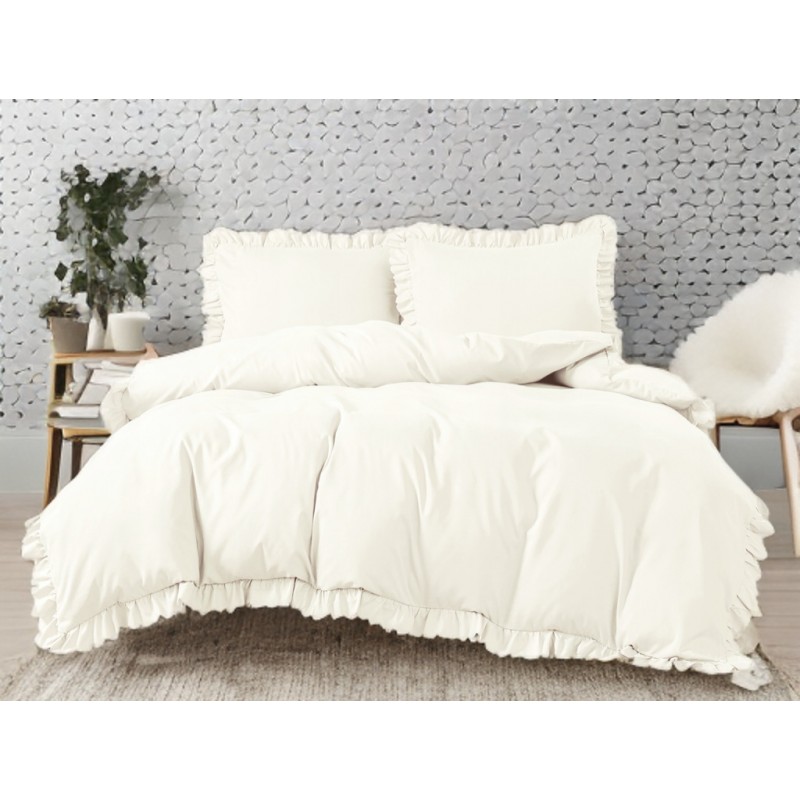 Culoarea crem, împreună cu volănaşele, creează un aspect luminos şi elegant, cu un accent decorativ care face patul să arate mai „aranjat”.