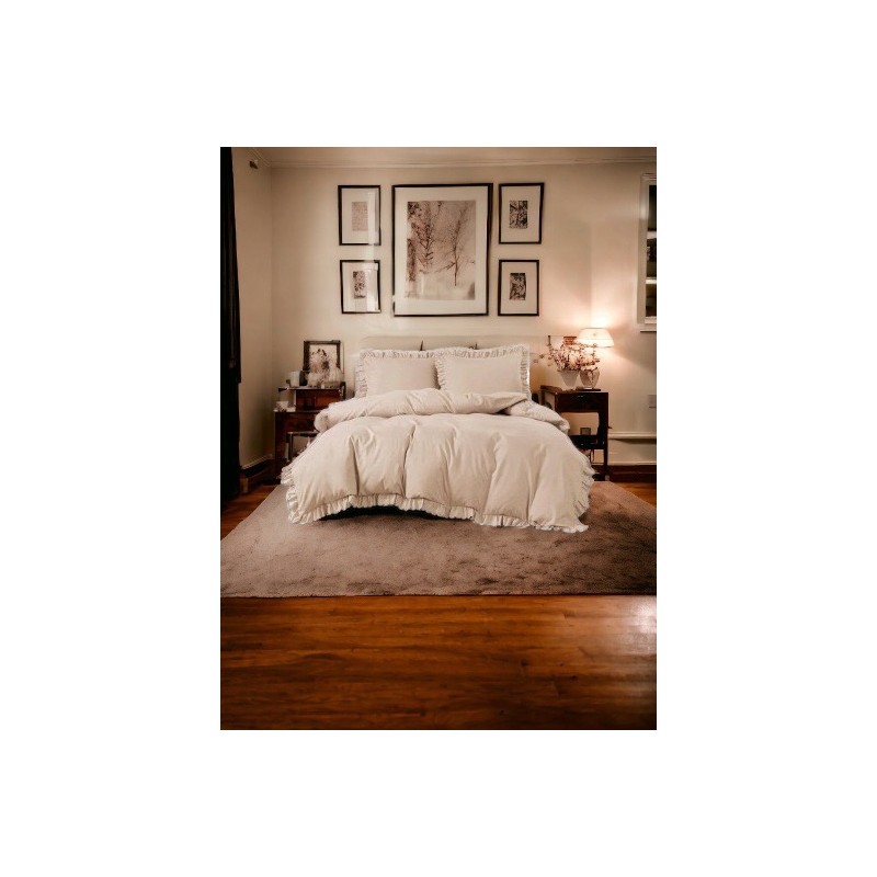 Culoarea bej, împreună cu volănaşele, creează un aspect calm şi elegant, punând în valoare caracterul decorativ al setului.
