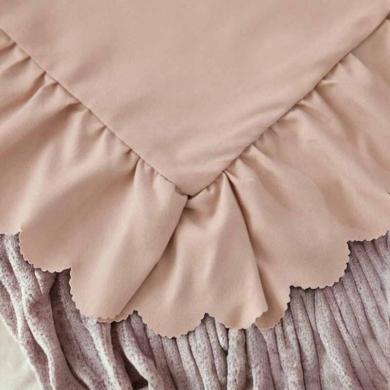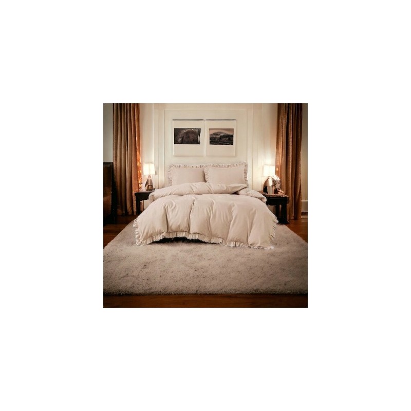 Culoarea bej, împreună cu volănaşele, creează un aspect calm şi elegant, punând în valoare caracterul decorativ al setului.