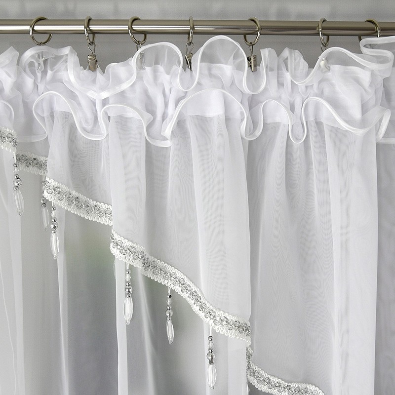 Perdea modernă din voal alb, în două straturi, cu mărgele elegante. Oferă un look spectaculos ferestrei, difuzează lumina şi se montează uşor datorită benzii universale.