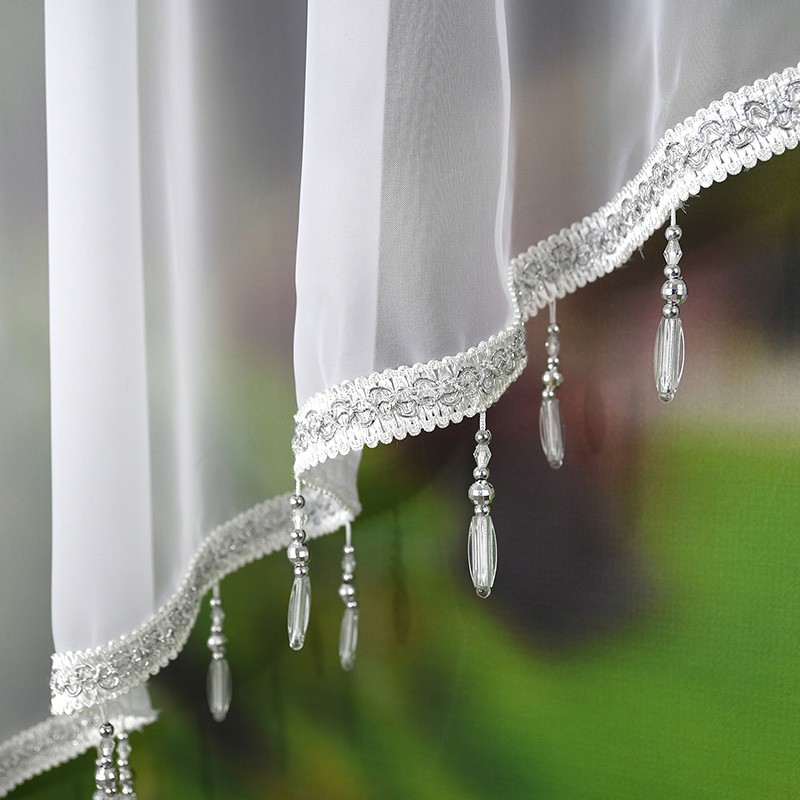 Este genul de decor care schimbă imediat atmosfera din cameră. Voalul alb, lejer, difuzează lumina şi aduce un aer luminos şi elegant, iar mărgelele oferă un accent strălucitor care atrage privirea. Designul în două straturi pune în valoare fereastra şi se potriveşte atât în amenajări moderne, cât şi clasice. Ideală pentru living, dormitor sau un birou elegant.
