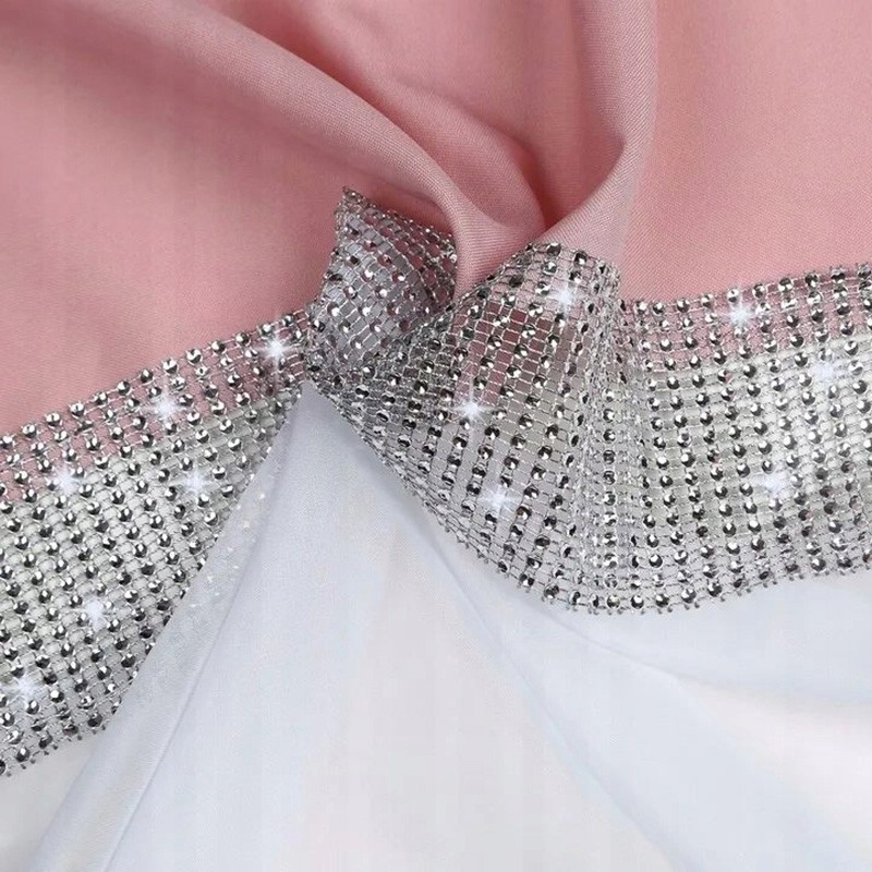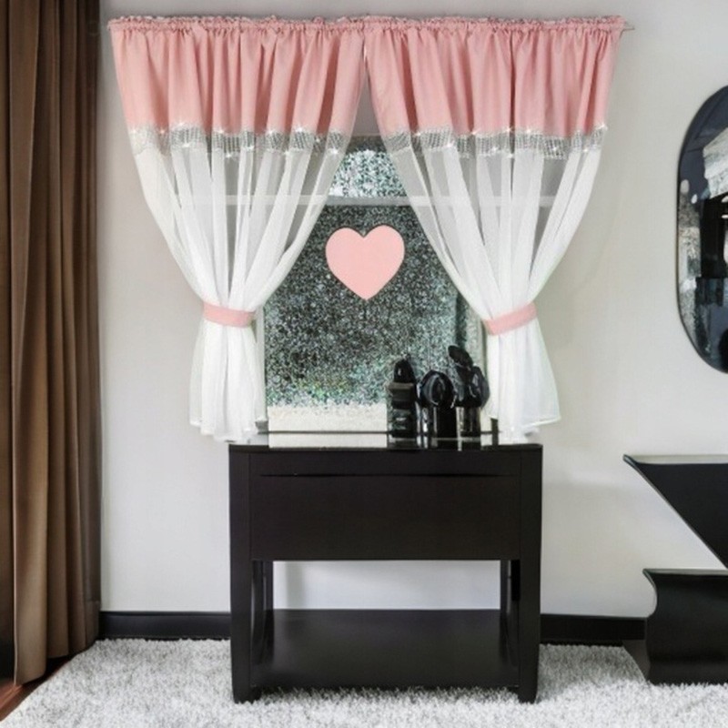 Combinaţia dintre albul luminos, accentul roz şi pietrele strălucitoare creează o paletă delicată, feminină, în stil glamour. Inima decorativă adaugă un caracter romantic şi face perdeaua uşor de remarcat.